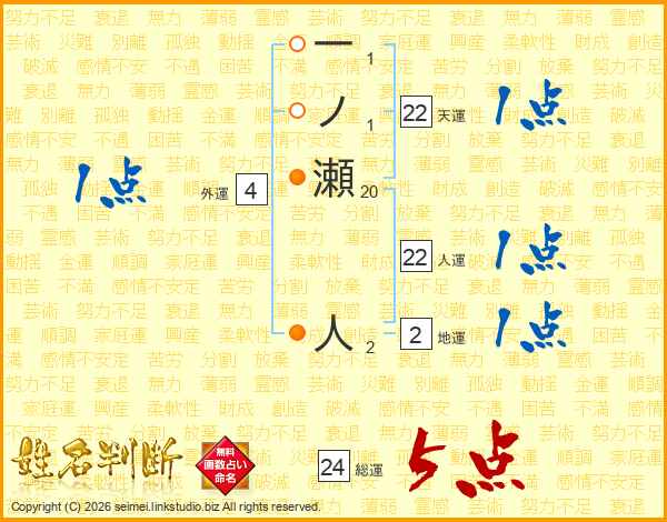 一(1画)ノ(1画)瀬(20画) 人(2画)