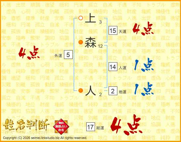 生活面を象徴する運勢です。外部から受ける影響力を表し、結婚運、家庭運や職場、環境への順応性を表します。総運から人運を引いた画数。姓や名が1文字の場合を除く。