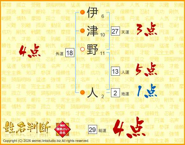 家系が持つ宿命的な運勢を表します。祖先から受け継いだ苗字ですので自分の力が及びません。家柄を象徴します。苗字の合計画数。