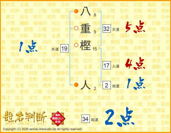 生活面を象徴する運勢です。外部から受ける影響力を表し、結婚運、家庭運や職場、環境への順応性を表します。総運から人運を引いた画数。姓や名が1文字の場合を除く。
