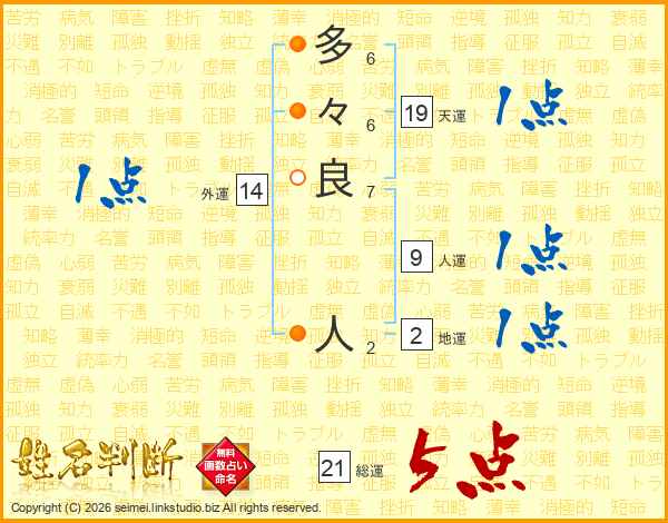 多々良人さんの総運は21画の5点!