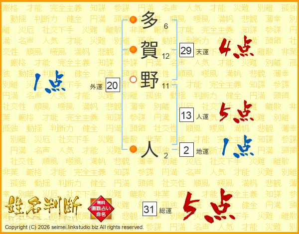 多賀野人さんの総運は31画の5点!