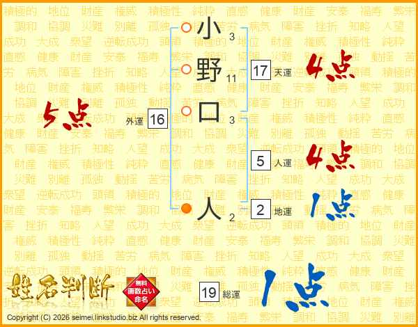 生活面を象徴する運勢です。外部から受ける影響力を表し、結婚運、家庭運や職場、環境への順応性を表します。総運から人運を引いた画数。姓や名が1文字の場合を除く。