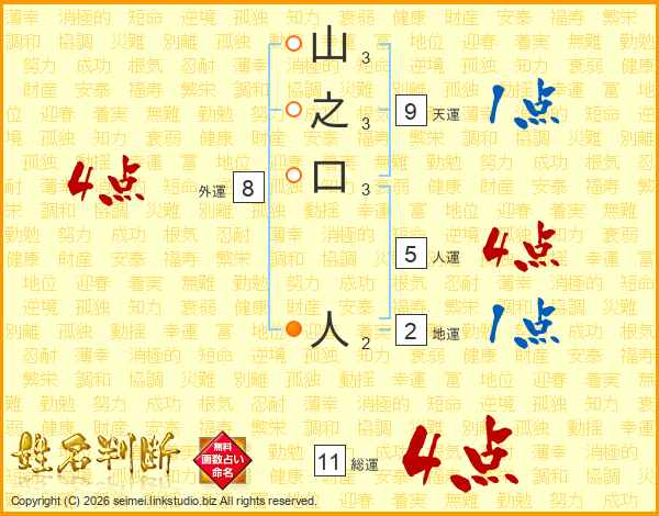 生活面を象徴する運勢です。外部から受ける影響力を表し、結婚運、家庭運や職場、環境への順応性を表します。総運から人運を引いた画数。姓や名が1文字の場合を除く。