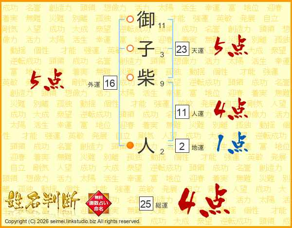 あなたの人生を表す1番重要な運勢です。生涯を通じて影響する総合運となり、主に50歳以降の晩年期に影響を及ぼします。苗字と名前の合計画数。
