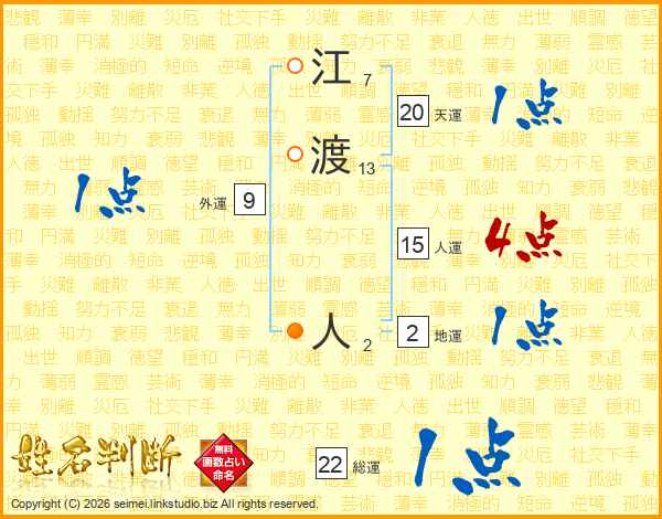 生活面を象徴する運勢です。外部から受ける影響力を表し、結婚運、家庭運や職場、環境への順応性を表します。総運から人運を引いた画数。姓や名が1文字の場合を除く。