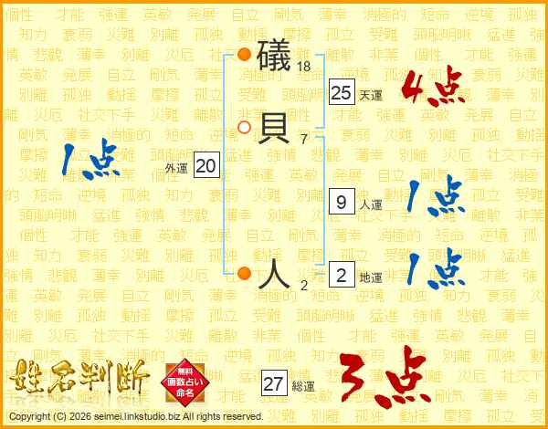 生活面を象徴する運勢です。外部から受ける影響力を表し、結婚運、家庭運や職場、環境への順応性を表します。総運から人運を引いた画数。姓や名が1文字の場合を除く。