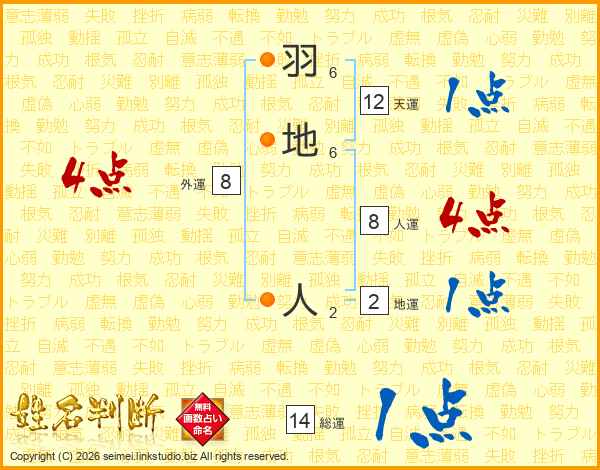 生活面を象徴する運勢です。外部から受ける影響力を表し、結婚運、家庭運や職場、環境への順応性を表します。総運から人運を引いた画数。姓や名が1文字の場合を除く。
