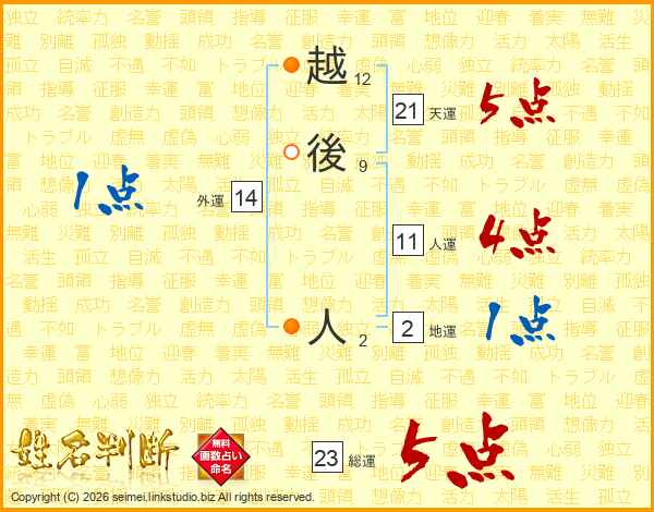 生活面を象徴する運勢です。外部から受ける影響力を表し、結婚運、家庭運や職場、環境への順応性を表します。総運から人運を引いた画数。姓や名が1文字の場合を除く。