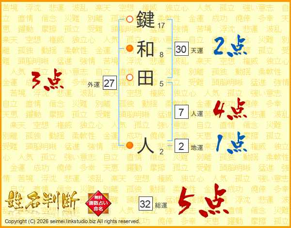 生活面を象徴する運勢です。外部から受ける影響力を表し、結婚運、家庭運や職場、環境への順応性を表します。総運から人運を引いた画数。姓や名が1文字の場合を除く。
