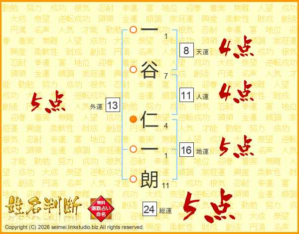 一(1画)谷(7画) 仁(4画)一(1画)朗(11画)