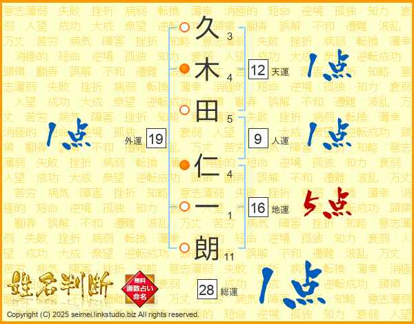 久(3画)木(4画)田(5画) 仁(4画)一(1画)朗(11画)