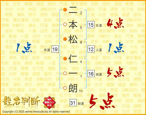 二(2画)本(5画)松(8画) 仁(4画)一(1画)朗(11画)