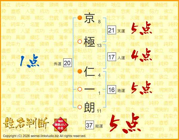 京(8画)極(13画) 仁(4画)一(1画)朗(11画)