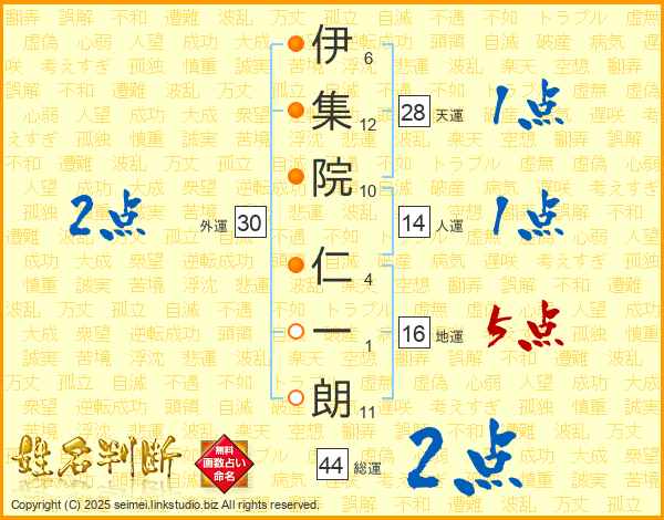 伊(6画)集(12画)院(10画) 仁(4画)一(1画)朗(11画)