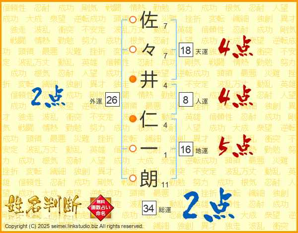 佐(7画)々(7画)井(4画) 仁(4画)一(1画)朗(11画)