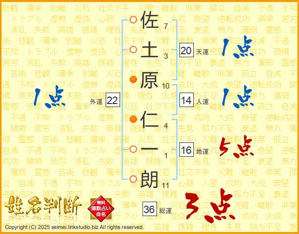 佐(7画)土(3画)原(10画) 仁(4画)一(1画)朗(11画)