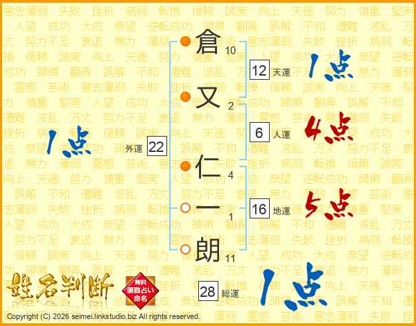 倉(10画)又(2画) 仁(4画)一(1画)朗(11画)