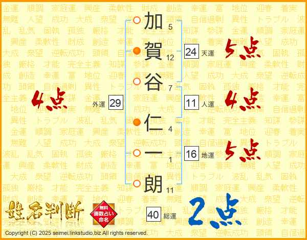 加(5画)賀(12画)谷(7画) 仁(4画)一(1画)朗(11画)