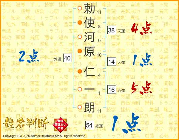 勅(11画)使(8画)河(9画)原(10画) 仁(4画)一(1画)朗(11画)