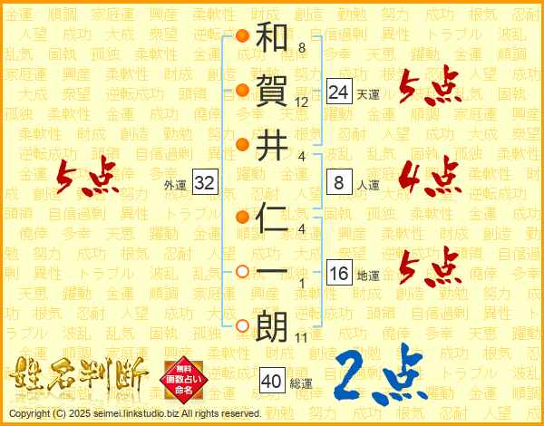 和(8画)賀(12画)井(4画) 仁(4画)一(1画)朗(11画)