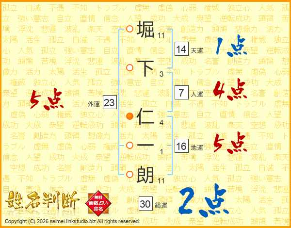 堀(11画)下(3画) 仁(4画)一(1画)朗(11画)