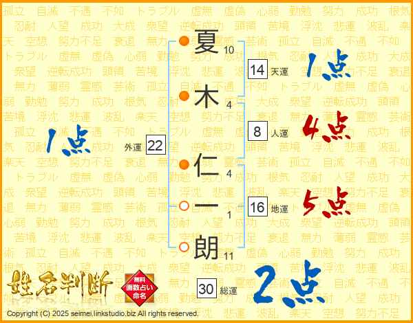 夏(10画)木(4画) 仁(4画)一(1画)朗(11画)