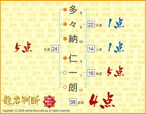 多(6画)々(6画)納(10画) 仁(4画)一(1画)朗(11画)