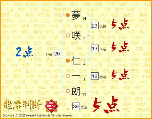 夢(14画)咲(9画) 仁(4画)一(1画)朗(11画)