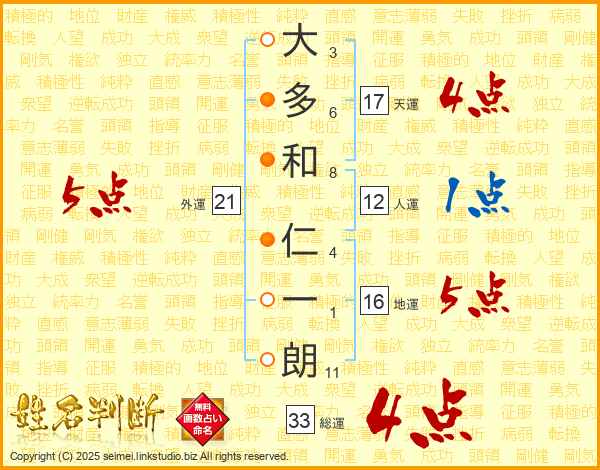 生活面を象徴する運勢です。外部から受ける影響力を表し、結婚運、家庭運や職場、環境への順応性を表します。総運から人運を引いた画数。姓や名が1文字の場合を除く。