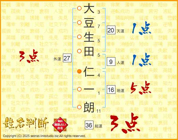 大豆生田仁一朗さんの総運は36画の3点!