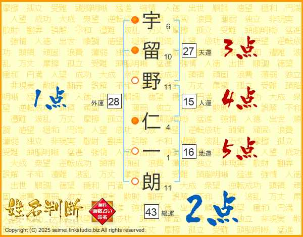 宇(6画)留(10画)野(11画) 仁(4画)一(1画)朗(11画)