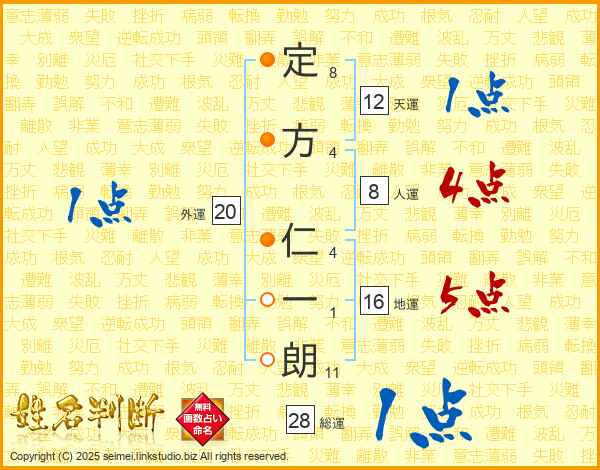 定(8画)方(4画) 仁(4画)一(1画)朗(11画)
