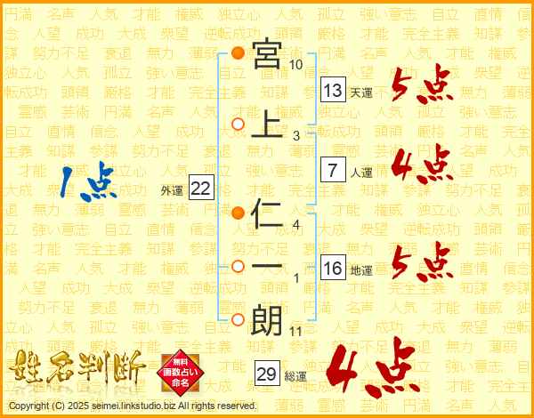 宮上仁一朗さんの総運は29画の4点!