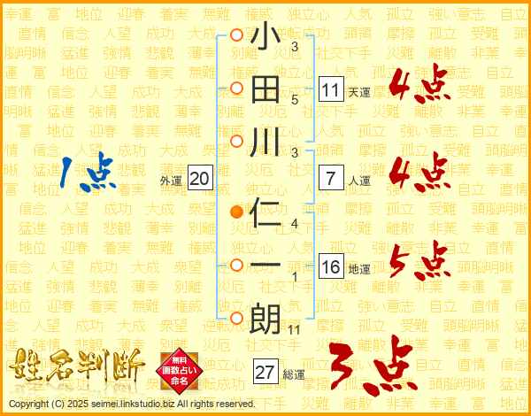 小(3画)田(5画)川(3画) 仁(4画)一(1画)朗(11画)