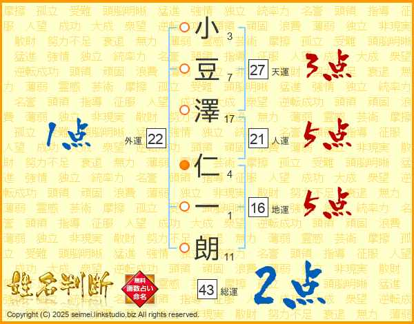 小(3画)豆(7画)澤(17画) 仁(4画)一(1画)朗(11画)