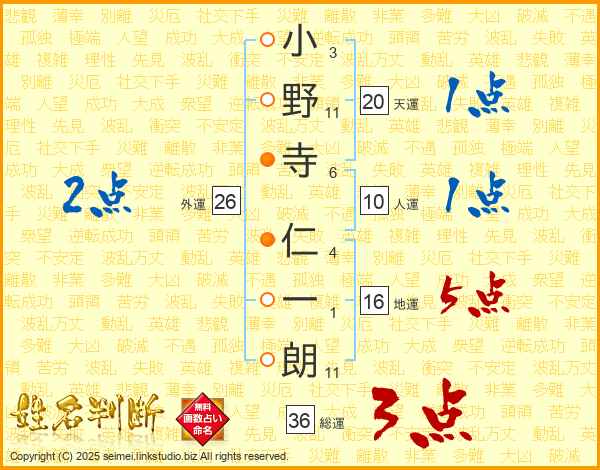 小(3画)野(11画)寺(6画) 仁(4画)一(1画)朗(11画)