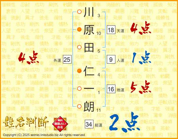 川(3画)原(10画)田(5画) 仁(4画)一(1画)朗(11画)