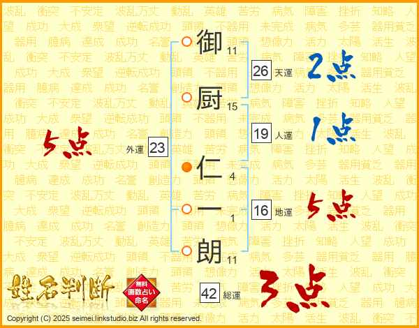 御(11画)厨(15画) 仁(4画)一(1画)朗(11画)