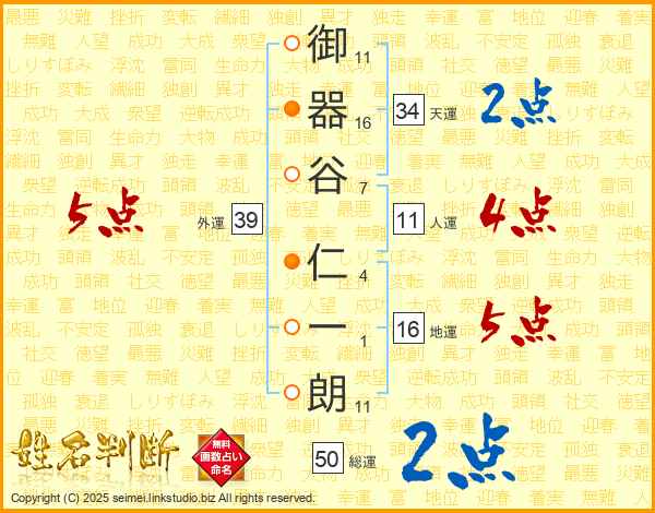 御(11画)器(16画)谷(7画) 仁(4画)一(1画)朗(11画)