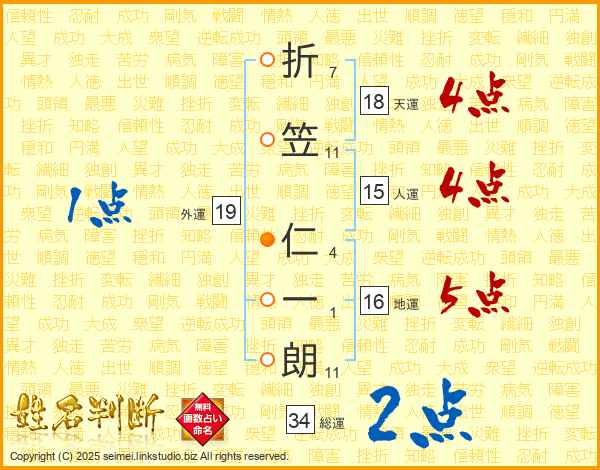折(7画)笠(11画) 仁(4画)一(1画)朗(11画)
