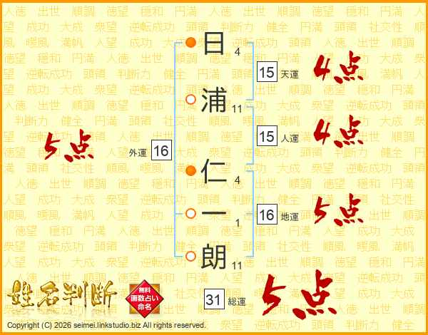 日(4画)浦(11画) 仁(4画)一(1画)朗(11画)