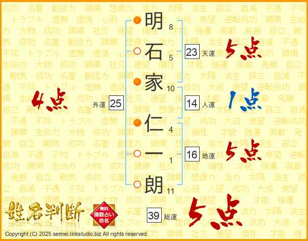 明(8画)石(5画)家(10画) 仁(4画)一(1画)朗(11画)