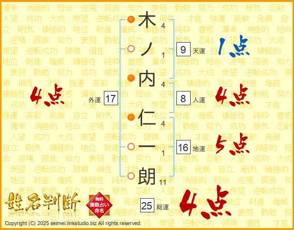 木(4画)ノ(1画)内(4画) 仁(4画)一(1画)朗(11画)