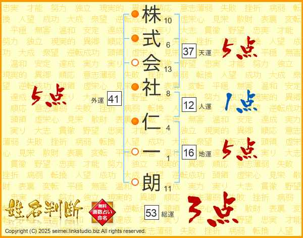 株(10画)式(6画)会(13画)社(8画) 仁(4画)一(1画)朗(11画)