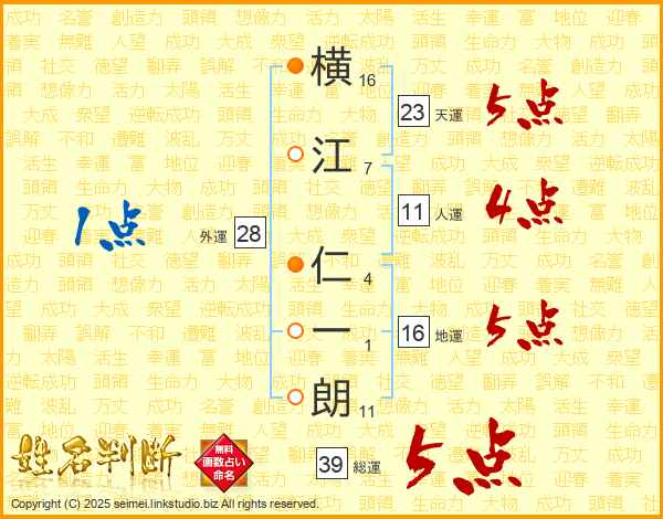 横(16画)江(7画) 仁(4画)一(1画)朗(11画)