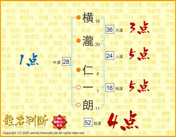 横瀧仁一朗さんの総運は52画の4点!