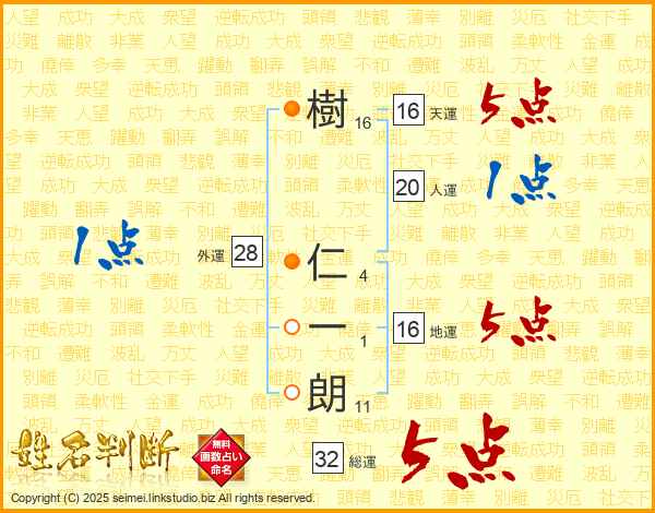 樹(16画) 仁(4画)一(1画)朗(11画)