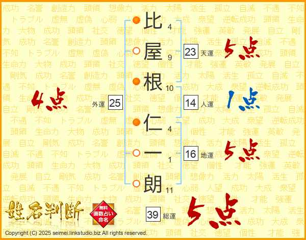 比屋根仁一朗さんの総運は39画の5点!