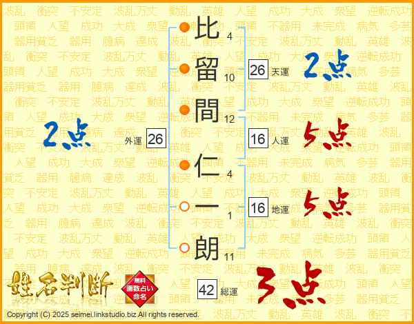 比(4画)留(10画)間(12画) 仁(4画)一(1画)朗(11画)